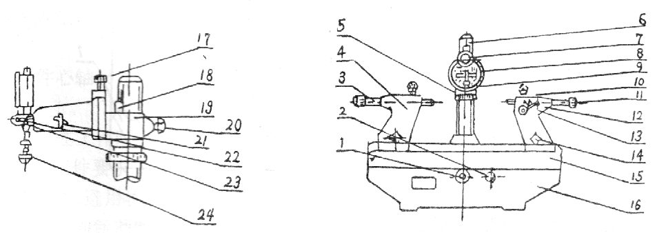1.膠木手柄  2.膠木螺帽  3.頂針  4.左頂針架  5.升降螺帽  6.立柱  7.千分表  8.測量支架  9.測量頭  10.膠木螺釘  11.M4膠木螺釘  12.右頂針架  13.手柄  14.膠木螺帽  15.臺面  16.底座  17.緊固螺釘  18.指標塊  19.測量座  20.膠木螺釘  21.手柄  22.螺釘  23.表架  24.接頭